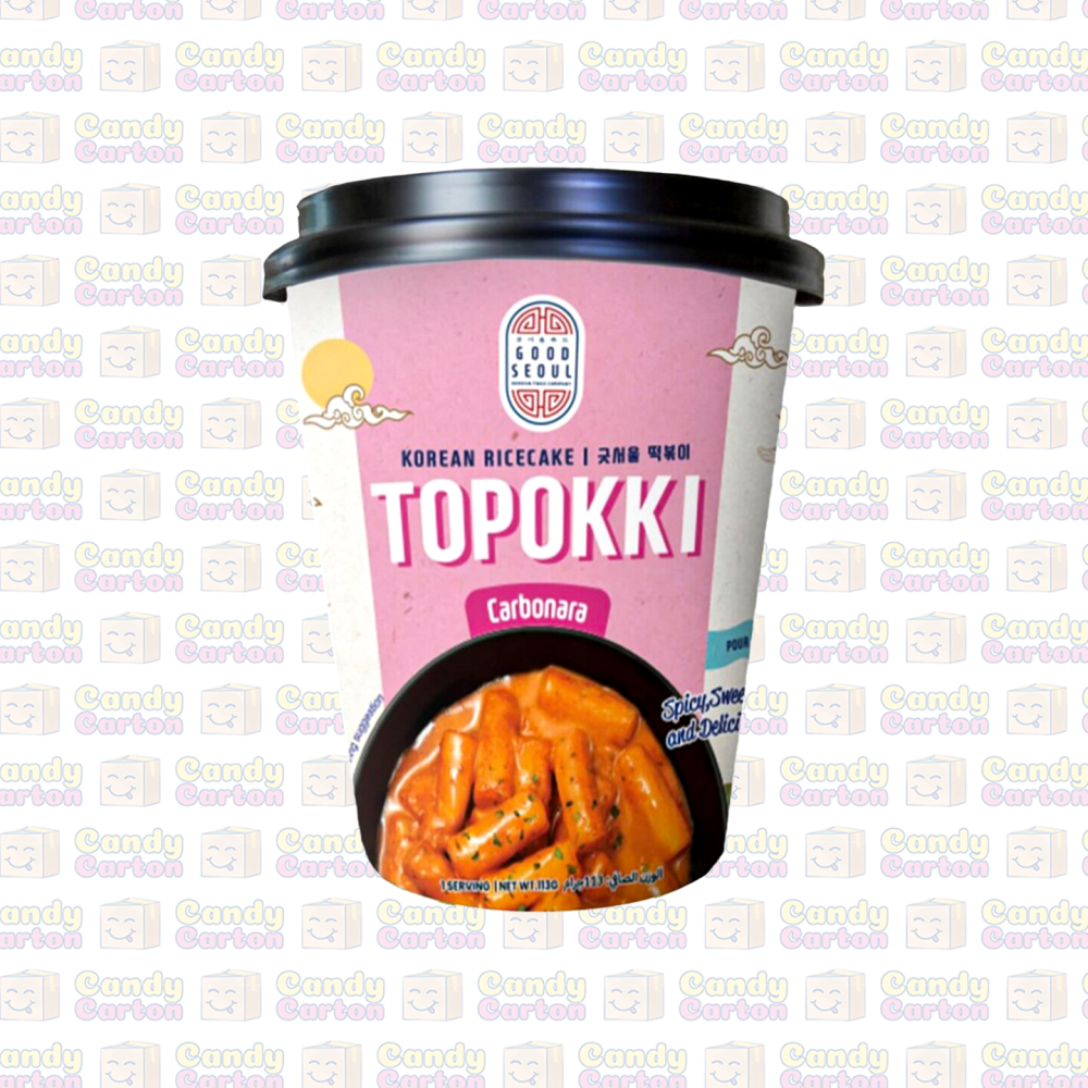 Enjoy the flavor of Korean rice cake with the Topokkie Korean Rice Cake Cup with Carbonara Cheese Flavor (113g) ! This product features a light pink color that adds an aesthetic touch, while the "Good Seoul" logo stands out elegantly on the glossy black lid.